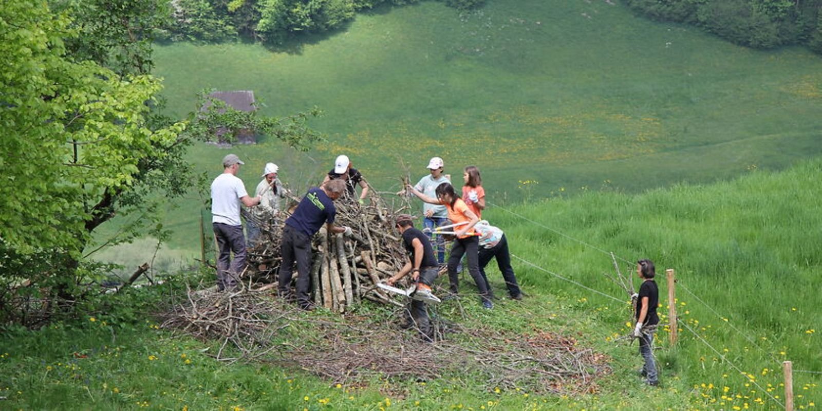 An diesem Natureinsatz sollen auf einer Waldlichtung in der Nähe von Appenzell mehrere Wieselverstecke aus Holz und Stein entstehen, so dass die Kleinsäuger genügend Möglichkeiten für die Jungenaufzucht haben.